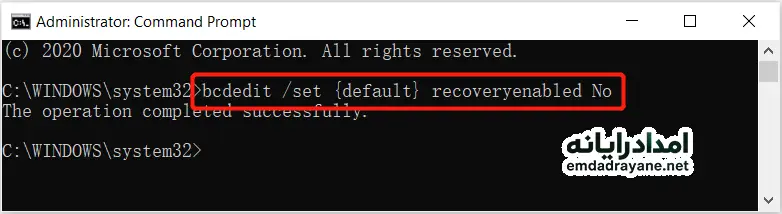 bcdedit /set recoveryenabled NO